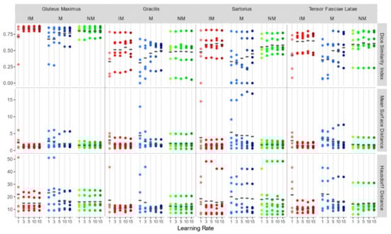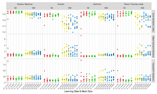 Considering the accuracy metrics of the four muscles separately, as shown in Figure 6, the same trend of the aggregated regions, with a larger value of DSI and smaller values of MSD for NM and IM groups was found. Registration performances, taking into account all schemes of the rigid transformation, were notably better for muscles with larger volumes (e.g., gluteus maximus and tensor fasciae latae).