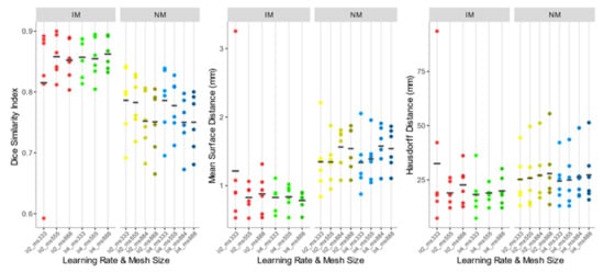 Accuracy indexes of the NM group are generally better for the 3×3×3 mesh, regardless of the learning rate, and tend to worsen as the mesh grows denser.
