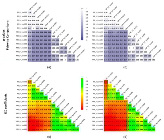 Statistical significance expressed as p-values of pairwise comparisons using the Wilcoxon rank sum test for (a) DSI and (b) MSD and intraclass correlation coefficients (ICCs) for (c) DSI and (d) MSD of the non-rigid registration step considering the 4 muscle ROIs together.