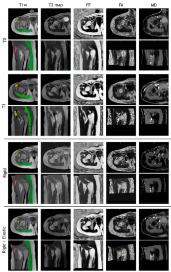 Manual landmarks-based registration was previously employed in muscle images [25], but since the process requires the identification of numerous points of reference in the muscle volume, this approach is too time-consuming for studies involving longitudinal acquisitions or multimodal scans. Therefore, in clinical studies, either inter-subjects or longitudinal intra-subjects, the alignment is performed using automatic intensity-based registration, typically consisting of two steps: a first transformation—rigid or affine—and a second nonlinear transformation to account for eventual relative position mismatch or natural movements of muscles and joints [26,27,28,29]. However, to the best of our knowledge, the accuracy of muscle MRI registration and the effect of the registration parameters choice on the final result have not been fully investigated, limiting the muscle registration procedure in most cases to a qualitative subjective process. To overcome this limitation, the aim of the present study is the definition of a reliable registration pipeline for longitudinal multimodal MRI studies of skeletal muscle tissue and its validation through well-established accuracy indexes.
