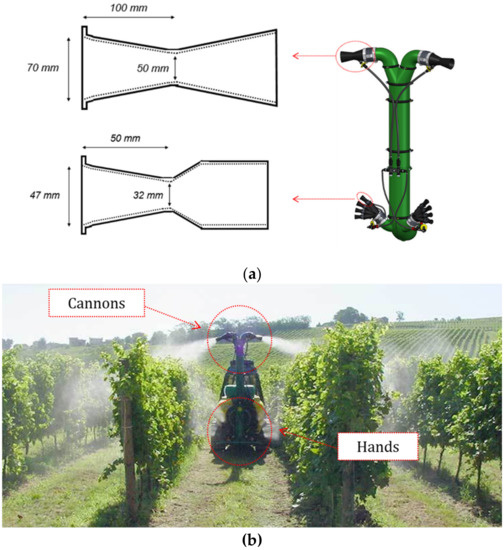 (a) Cannon-type and hand-type spouts mounted on the spray head TC.2M2C.50P for (b) multiple-row spray application in a vineyard.