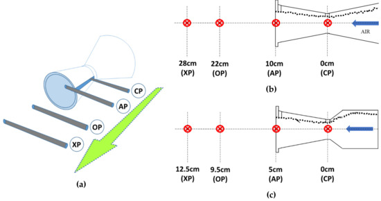 (a) Liquid hose positions from the inner to the outer part of spouts (green arrow): conventional position (CP) (0 cm reference) passing through alternative position (AP), out position (OP) and extreme position (XP). Distances (cm) from the reference position were different for (b) the cannon-type and (c) the hand-type spouts.