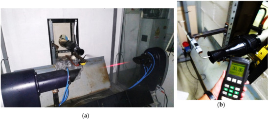 The measurement of the airflow speed was performed with a Pitot-tube-based anemometer Testo 400 (Testo SE & Co. KGaA, Lenzkirch, Germany) (Figure 3b) at 1Hz frequency with a measurement resolution of ±0.01 hPa, a differential pressure corresponding to 1.28 m s−1, and a measurement range of up to +2000 hPa (571.43 m s−1). The instrument was fixed to an ad hoc support developed by the researchers with some modifications to properly adapt it to the experiment [55]. The main advantage of this support was the possibility to keep the air speed measurement instrument in the center of the air spout (Figure 3b), avoiding errors that could deeply affect the measurements when holding it manually. The modifications in the instrument were essentially aimed at an enlargement of the holding tube to measure speed in the outermost position of the liquid hose (XP). Thus, the airflow speeds were measured along the central axis in six positions, corresponding to 0, 5, 10, 16, 22 and 28 cm to the CP for the cannon-type spout and in five positions, corresponding to 0, 2.5, 5.0, 9.5 and 12.5 cm in a single spout for the hand-type nozzle. Preliminary trials were conducted to ensure the airflows generated individually by the four spouts that composed the hand-type nozzle were comparable. In each sampling position, the data were recorded for 60 s per each of the three replicates performed.