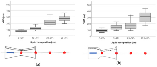 The VMDs, or D50 values, distribution per liquid hose positions are shown separately by nozzle type in Figure 5. In general, the cannon (Figure 5a) generated finer droplets than the hand-type nozzle did (Figure 5b), with median values in their conventional insertion position of the liquid hose (CP) of 76 vs 95 µm, respectively. This fact is consistent with the observations made in previous droplet size characterization tests [53]. Nonetheless, there was a higher capacity to proportionally increase D50 values in the cannon (265% vs 223% total increase from CP to XP, Figure 5), which makes it possible to produce relatively similar drops in the XP in both the cannon- and hand-type nozzles (270 vs 307 µm, Figure 5). When looking at the distribution of the D50 droplets in the different tested positions, values in the cannon spout were more homogeneously distributed than those in the hand spout. Thus, the first nozzle generated a D50 value of 74 µm at the reference position (CP), whereas values were 112, 205 and 270 µm at AP, OP and XP positions, respectively. The last three values corresponded to 51%, 177% and 265% droplet diameter increase when compared to the reference position (CP). For the hand-shaped nozzle, a 95 µm droplet diameter was recorded at CP. Diameters at AP (145 µm), OP (160 µm) and XP (307 µm) were 53%, 68% and 223% larger, respectively, than those recorded at CP. As it can be seen (Figure 5), values were more heterogeneous in the hand-type nozzle (b) when compared to the cannon ones (a). The D50 variability (shown by the interquartile rate in Figure 5) in both nozzles increased with increasing distances from CP. This is also consistent with previous works characterizing pneumatic sprayer droplet size, as the droplet size indicators (D50 among them) can be predicted with linear models, which are affected by the liquid flow rate and air speed [53]. When comparing these global results with the air speed decrease rate (Figure 5), data were consistent in the cannon-type nozzle. Air speed decrease did not present extreme values along any of the measured sections, so a progressive droplet size increase was expected. On the other hand, the hand-type nozzle presented more extreme air speed decrease values, so the higher heterogeneity of data would be explained.