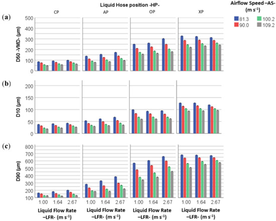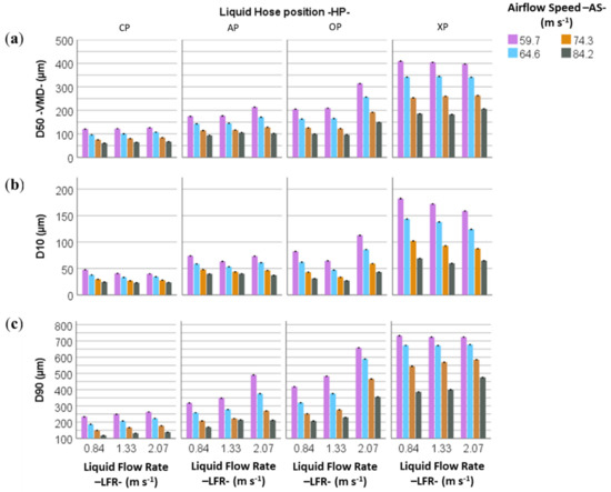 D50, D10 and D90 values were significantly affected by the liquid hose position (HP), the LFR and the AS (p < 0.001, Figure 6a). In general, an increment in the droplet size can be observed for every indicator (D50, D10 and D90) with the increase of the liquid hose insertion distance to the original one. In this sense, moving the hose out of the spout generated an important increment in the droplet size, as expected by taking into account the air speed decrease found in the present work (Figure 4). This fact was also summarized in Figure 5a, where a clear increase in this parameter was found when increasing distance. As shown in previous works, air speed and liquid flow rate play key roles on droplet size [53,55]. Thus, the first parameter generates a clear decrease on the drop size and the second one behaves the opposite. Regarding D50, nearly every value obtained in the CP was lower than 100 µm (Figure 6a). This contrasts with the case of the XP, where every value was above 200 µm. AP and OP presented intermediate responses. Maximum and minimum D50 mean values were 325 µm (with XP, minimum LFR and minimum AS) and 49 µm (with CP, minimum LFR and maximum AS). In general, increments of D50 values were in the range 30%–94%: between 50% and 75% moving the liquid hose position from CP to AP, between 79% and 94% when the liquid hose was shifted from AP to OP and between 30%–43% when it was further moved to XP.