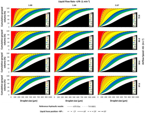 The cumulative sprayed volume curves, obtained by each tested configuration together with the reference hydraulic nozzles were compared with American Society of Agricultural and Biological Engineers (ASABE) nozzle classifications (ASABE S572.1) [63].