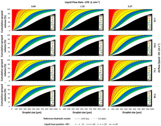 The cumulative sprayed volume curves, obtained with cannon (Figure 8) and hand-type (Figure 9) nozzles by testing all configurations (combination of HP, LFR and AS), compared with the American Society of Agricultural and Biological Engineers (ASABE) nozzles classifications (ASABE S572.1) [63], showed that an appropriate selection of pneumatic sprayer operational parameters, namely LFR and AS, led to a limited change in the spray quality generated, varying from very fine (VF) to fine (F) in the best cases. On the contrary, changing HP deeply affected the spray quality and reached the coarse (C) (Figure 8) and very coarse (VC) (Figure 9) spray quality when the liquid hose was tested in the extreme position (XP) combined with reduced AS, irrespective of LFR. Even if Balsari et al. [53] recognize the importance of a proper selection of LFR and AS parameters in order to vary the spray quality in conventional pneumatic sprayers, likewise it was clear that the spray quality extent change from VF to F was not enough to guarantee environmental safeguard, despite the increased droplet size dimension. For this reason, according to the preliminary tests performed by Miranda-Fuentes et al. [55], the HP change along the pneumatic spouts is proven as the driving factor for changing the spray quality. This strategy allows to achieve a range of different spray qualities comparable to that reachable with hydraulic nozzles, which can be varied in type (conventional vs. air induction) and size [43]. Thus, at the time of application, in both pneumatic nozzle types the selection of HP allowed to vary the spray quality in a wide range without changing the other operational parameters selected for the application (LFR and AS). In detail, the cumulative sprayed volume curves derived from the tested configurations using the liquid hose in conventional position (CP) showed a droplet spectrum similar to the hydraulic nozzles Albuz® ATR lilac used at 0.7 MPa (Figure 8 and Figure 9) and selected as reference. Only the hand-type nozzle tested in CP position with AS of 59.7 and 64.6 m s−1 showed a coarser spray quality, namely fine (F), irrespective of LFR (Figure 9). On the contrary, none of the tested configurations with both cannon- and hand-type pneumatic nozzles in XP position achieved the extra coarse (XC) spray quality, likewise that generated by the air-induction Albuz® TVI8001 nozzles (0.7 MPa pressure) used as reference nozzle for the coarse spray quality (Figure 8 and Figure 9). In general, the liquid hose position in AP and OP allowed intermediate spray quality, varying from F to M according to the LFR and AS selected. Even when the hand-type nozzle generated averagely larger droplets than the cannon-type did, the spray quality produced by both of them, for the same tested configuration, was very similar (Figure 8 and Figure 9). In practice, no substantial difference in prospective coverage of the leaves and fruits could be noticed between the two nozzle types. In any case, the possibility to vary in a wide range the droplet size by simply adjusting the liquid hose position gives, for the first time, the opportunity to both farmers and technicians to match the environmental requirements, balancing at the same time the treatment specifications for every spray application while using pneumatic spraying in vineyards. Recently, Grella et al. [58] demonstrated through field trials that the variation in the spray quality over the range investigated (from CP to XP) did not affect the canopy coverage, while coarser sprays (liquid hose in AP and XP) produced greater deposits on the target. Concurrently, the use of cannon spout in XP position significantly reduced the off-field ground losses in the downwind area.