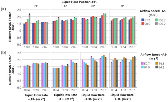 Relative SPAN Factor (RSF) per liquid hose position (HP), liquid flow rate (LFR) and airflow speed (AS) for both the (a) cannon-type and (b) hand-type nozzles. Bars show the mean ±Standard Error. CP, conventional insertion of liquid hose position; AP, alternative position; OP, out position; XP, extreme position.