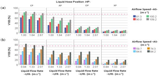 Indeed, in the case of the cannon-type nozzle, there was a consistent V100 reduction among consecutive hose positions. Thus, from a mean value of 68% in CP, the V100 mean value decreased to 8% in XP (Figure 11a). Within each liquid hose position, the combination of minimum LFR with maximum AS and maximum LFR with minimum AS deeply affected the driftability. These settings yielded mean V100 values of 49 ± 2% (max LFR/ min AS) and 61 ± 2% (min LFR/max AS) in CP (Figure 10a). AP gave V100 results between 21 ± 1% (max LFR/ min AS) and 64 ± 2% (min LFR/max AS). OP resulted in a range from 10 ± 1% (max LFR/ min AS) to 21 ± 1% (min LFR/max AS). Finally, XP values ranged from 5 ± 1% (min LFR/ min AS) to 10 ± 1% (min LFR/max AS) (Figure 10a). In a practical way, the best V100 reduction within each hose position was always achieved when the system was operated with the maximum LFR and minimum AS, confirming the marked influence of these operational parameters [53].