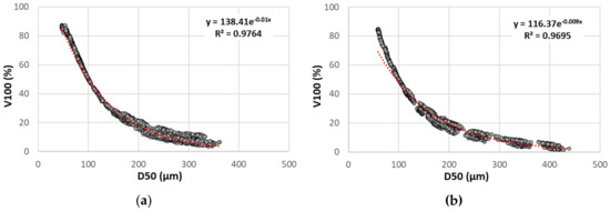 As it can be drawn from Figure 12, there was a clear correlation between V100 and D50 in both cases (p < 0.001). Determination coefficients were very similar (0.9764 and 0.9704 in the cannon-type (Figure 12a) and hand-type (Figure 12b) nozzles), and the correlation coefficients were nearly the same (−0.01 and −0.009). This result indicates that both nozzles have similar behavior. Moreover, this kind of response can be expected from different pneumatic nozzles. In the case of the cannon, there was a deviation of the regression line with high D50 values. This behavior can be expected when taking into account the higher variability that is found in the most extreme positions of the liquid hose (Figure 12a). A similar trend can be noticed in the hand nozzle for which a loss of fitting in the lowest D50 values can be observed (Figure 12b).