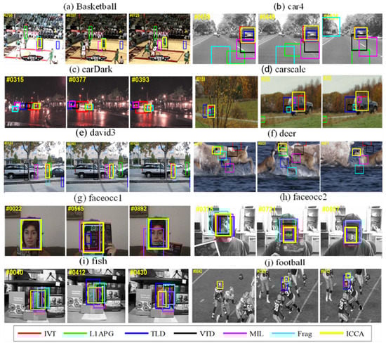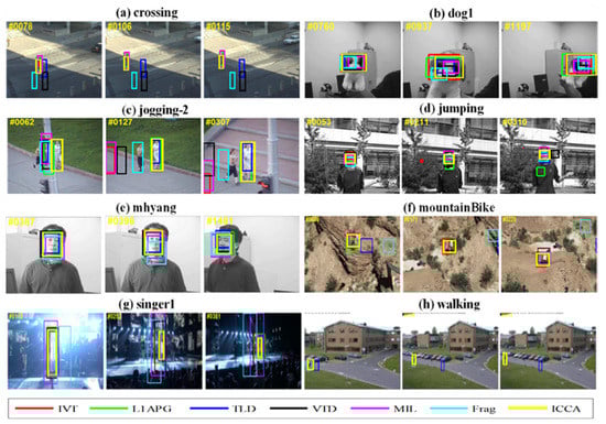 Figure 1a,j show good tracking ability of ICCA, which is better than other trackers in the football video. In the three videos of car4, cardark, and carscale, fast-moving cars drive on the streets during the day and night, as well as on the outdoor roads during the day. For the video car4, when the car passes through the overpass or under the shade of trees, its surface light changes greatly. In the video cardark, cars on the street at night are easily blurred by the brightness of other lights or street lights. The car in the video carscale will drive from far to near, and the scale will change when passing through a cluster of branches. Figure 1b–d shows that ICCA tracking results are attractive. In Figure 1e, namely, the video david3, the tracked person walks outdoors. In the process of walking back and forth, it is occluded twice by the trunk. Most tracking algorithms lose the target, while ICCA still works stably. In the deer video sequences, most algorithms fail because the tracked deer is very similar to the surrounding background and moves rapidly; ICCA effectively performs the tracking. The dog in the video Dog1 moves from near to far but slowly, thus most methods can track the target stably. As in Figure 1, the videos faceocc1, faceocc2, and jogging-2 share the common things: the tracked targets are all sometimes occluded, especially the target in jogging-2 has almost complete occlusion, and the color of the occlusion appearance is very similar to the target. ICCA works well and shows its effectiveness. In the video fish, because the camera is shaking slightly, it is more difficult to track the target. ICCA can track the target accurately. In Figure 2a, since the building in the video crossing blocks the sun, the pedestrian tracking is relatively stable in the building shadow. When walking to the shadow and direct light, illumination variations are quite different. In this case, most trackers miss the target, but ICCA can still track the target even when the tracking bounding box size changes a little. In the singer1 video, the background clutter affects the effective learning of the subspace. Likewise, ICCA can track the target correctly.
