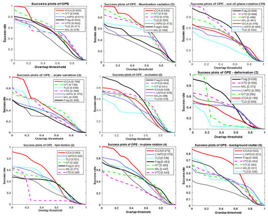To quantify the visual tracking performance of ICCA, seven trackers were evaluated and compared by success rate and precision. It can be seen from Figure 3 that ICCA has almost the best comprehensive performance, and has a high success rate on different attributes, such as background speckle illumination, scale change, rapid movement, and small rotation of objects, but it achieves slightly worse performance than other trackers on out-of-plane rotation, occlusion, and deformation.