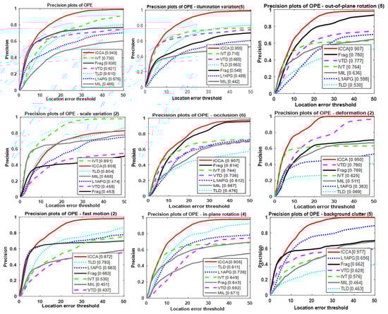 Figure 4 shows the precision comparison of seven trackers over 18 video sequences. ICCA is consistently superior to other trackers for high accuracy on most attributes. Since ICCA just accelerates CCA without improving the robustness of target appearance, the trackers based on ICCA are still sensitive to the occlusion, scale size, and deformation. Thus, on such attributes, the performance based on ICCA is slightly lower than other trackers. We cannot guarantee our tracker to work on all the videos because we only improve the efficiency of CCA rather than its model capacity.