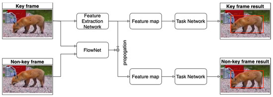 For video object detection, it is challenging to apply the state-of-the-art object detection approaches for still images directly to each image frame in video data for the reasons stated earlier. Therefore, based on FlowNet, the DFF method was proposed in [28] to address these shortcomings: (i) computation time of feature map extraction for each frame in video, (ii) similarity of features obtained on two adjacent frames, (iii) propagation of feature maps from one frame to another. In [28], a convolutional neural sub-network, ResNet-101, was employed to extract the feature map on sparse key frames. Features on non-key frames were obtained by warping the feature map on key frames with the flow field generated by FlowNet [111] instead of getting extracted by ResNet-101. The framework is shown in Figure 3. This method accelerates the object detection on non-key frames. On the ImageNet VID dataset [5], DFF achieved an accuracy of 73.1% mAP with 20 fps, while the baseline accuracy on a single frame was 73.9% with 4 fps. This method significantly advanced the practical aspect of video object detection.