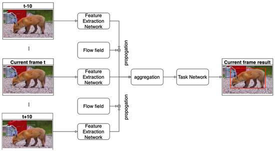 In [22], a flow-guided feature aggregation (FGFA) method was proposed to improve the detection accuracy due to motion blur, rare poses, video defocus, etc. Feature maps were extracted on each frame in video using ResNet-101 [112]. In order to enhance the feature maps of a current frame, the feature maps of its nearby frames were warped to the current frame according to the motion information obtained by the optical flow network. The warped feature maps and extracted feature maps on the current frame were then inputted into a small sub-network to obtain a new embedding feature, which was used for a similarity measure based on the cosine similarity metric [113] to compute the weights. Next, the features were aggregated according to the weights. Finally, the aggregated feature maps were inputted into a shallow detection-specific sub-network to obtain the final detection outcome on the current frame. The framework of FGFA is shown in Figure 4. Based on the ImageNet VID dataset, FGFA achieved an accuracy of 76.3% mAP with 1.36 fps, which was higher than DFF.