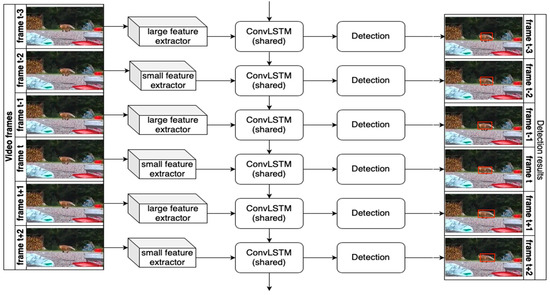Considering a video snippet as video frames V = {I0, I1, I2, … It}, the model is viewed as a function , where denotes the detection outcome of the video object detector and represents a vector of feature maps up to the video frame t. Each feature map of is the state input to the LSTM and is the state output. The state unit of LSTM contains the temporal information. LSTM can combine the state unit with input features, adaptively adding the temporal information to the input features, and updating the state unit at the same time. In [71], it was stated that such a convolutional LSTM layers could be added to any layer of the original object detector to refine the input features of the next layer. An LSTM layer could be placed immediately after any feature map. Placing the LSTM earlier would lead to larger input volumes and much higher computational costs. In [71], the convolutional LSTM was placed only after the Conv13 layer, which was proved to be most effective through experimental analysis. This method was evaluated on the ImageNet VID 2015 dataset [5] and achieved a good performance in terms of the model size and computational efficiency (15 fps on a mobile CPU), with an accuracy comparable to those more computationally demanding single frame models.