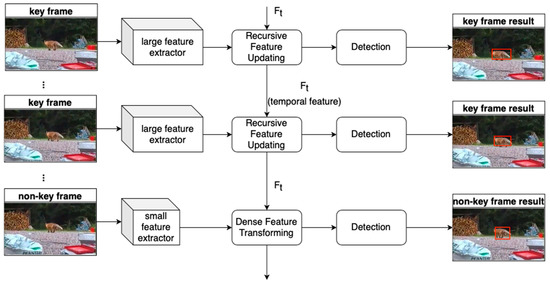 Similarly, inspired by the observation that object tracking is more efficient than object detection, a framework (D or T) was covered in [80], see Figure 9, which includes a scheduler network to determine the operation (detecting or tracking) on a certain frame. Compared with the baseline frame skipping (detecting on fixed interval frames and tracking on intermediate frames), the scheduler network with light weights and a simple structure was found to be more effective on the ImageNet VID dataset. Moreover, the adaptive mechanism in [26] (TRACKING ASSISTED) was used to select key frames. Detection on key frames involved the utilization of an accurate detection network and detection on non-key frames was assisted by the tracking module.