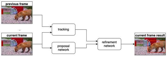 Another framework named CaTDet with a high computational efficiency was presented in [78]. This framework is shown in Figure 8, which includes a tracker and a detector. CaTDet uses a tracker to predict the position of objects with a high confidence in a next frame. The processing steps of CaTDet are: (i) Every frame is inputted to a proposal network to output potential proposals in the frame. (ii) Object position in a next frame is predicted with a high confidence using the tracker. (iii) In order to obtain the calibrated object information, the outputs of the tracker and the proposal network are combined and inputted to a refinement network.