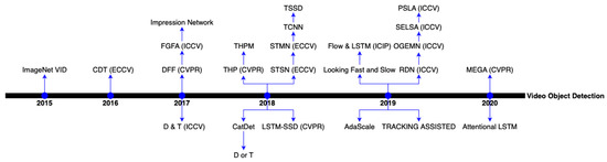 The great majority of video object detection approaches use the ImageNet VID dataset [5] for performance evaluation. In this section, the timeline of video object detection methods in recent years is shown in Figure 11 together with a group listing of the methods in Figure 12. Then, a comparison is provided between the methods covered in the previous section. The comparison is presented in Table 4 and Table 5, which correspond to with and without post-processing, respectively. The methods in Figure 11 belong to different groups but the same time, whereas the methods in Figure 12 belong to different times but the same groups. As can be seen from Figure 11 and Figure 12, the methods based on optical flow were proposed earlier. During the same period, video object detection methods were assisted by tracking due to the effectiveness of tracking in utilizing the temporal–spatial information. The optical flow-based methods needed a large number of parameters and they were only suitable for small motions. In recent years, the methods based on attention have achieved much success, such as MEGA [25]. Using LSTM for feature propagation and aggregation is becoming a hot research topic and many new methods are being proposed, such as STSN [83] using deformable convolution to align the feature maps. The latest research is mostly based on attention, LSTM or a combination of methods such as Flow&LSTM [72].