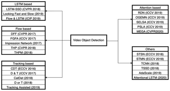 For video object detection, in order to make full use of the video characteristics, different methods are considered to capture the temporal–spatial relationship. Some papers have considered the traditional methods [29,30,31,32,33,34,35,36,37,38,39,40,41,42]. These papers heavily rely on the manual design leading to the shortcomings of low accuracy and the lack of robustness to noise sources. More recently, deep learning solutions have attempted to overcome these shortcomings. As shown in Figure 2, based on the utilization of the temporal information and the aggregation of features extracted from video snippets, video object detectors can be divided into flow-based [22,27,28,67,68,69], LSTM-based [70,71,72,73], attention-based [25,74,75,76,77], tracking-based [26,78,79,80,81,82] and other methods [36,83,84,85,86,87,88,89,90]. These methods are described in more detail below.