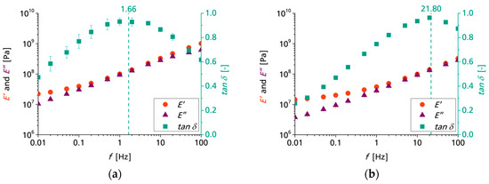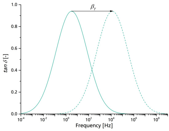 According to the time–temperature superposition principle, the shift factors βT (Table 3) can be calculated using Equation (2). The temperature of −50 °C was chosen as the reference temperature T0. As expected, the peak frequency of tan δ shifts to higher frequencies for higher temperatures.