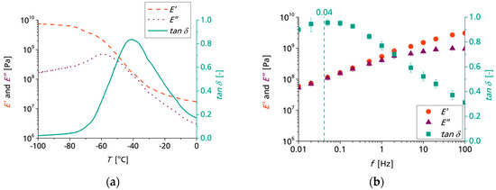 First, a temperature sweep (Figure 5a) was carried out to obtain the glass transition temperature of the rubber compound. Afterwards, frequency sweeps above Tg (Figure 5b and Figure 6) were conducted to characterize the temperature dependence of the glass transition. In both experiments the dynamic moduli E′ and E″ were measured for a given temperature or frequency range to examine their temperature and frequency dependency. The peak of tan δ, which is the ratio of E′ and E″, was used to determine the glass transition temperature and frequency.
