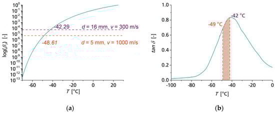 It is now possible to determine the temperature range that corresponds to the frequencies induced during ballistic impact. The plot of Equation (1) including the new values for C′1, C′2 and T′ is shown in Figure 7a. With decreasing armor thickness and increasing projectile velocity, the temperature that corresponds to the impact frequency decreases. By comparison with the temperature sweep of butyl rubber (Figure 7b), it can be concluded that frequencies induced during ballistic impact are located in the area of maximized damping of the material. Even for high projectile velocities (1000 m/s) and very thin armors (5 mm), the temperature of −49 °C corresponds to a tan δ of 0.7, which still is 84% of the maximum tan δ of the analyzed rubber compound. A tan δ of around 0.1 can be seen as the minimum value necessary for a damping material [22]. The experimental values of the manufactured butyl rubber are much higher, which leads to the assumption that it could be a well-suited damping material for ballistic protection.