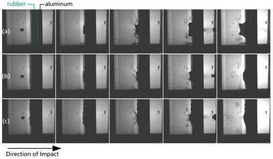 In the first experimental series, the impact behavior of the rubber-coated aluminum plates was observed with a high-speed camera. The images of the impact experiments are shown in Figure 8.