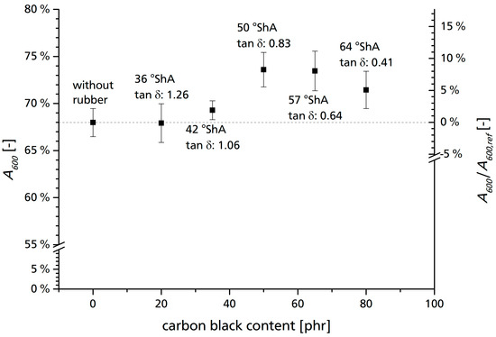 The standardized mean values for each configuration are given in Table 5 and plotted in Figure 10. A600/A600,ref is used as a measurement for the improvement over the reference configuration without rubber.