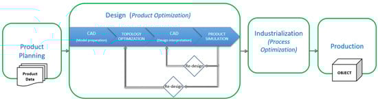 The workflow consists of four main phases: The product planning phase leads to the complete definition of the product data, considering design targets and constraints, and including testing results and users’ suggestions. Concerning the design phase, the product optimisation and validation tasks aim to achieve the established targets. In the industrialisation phase, process study and 3D printing preparation are mandatory, while additional optimisation can be performed. The production phase covers 3D printing and post-processing operations necessary to provide the user with the optimised product version.