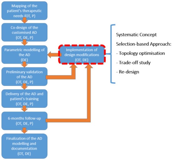 12]. Product customisation is made possible thanks to the patient’s involvement through a co-design approach. The workflow is composed by sundry different tasks to be performed in sequence. These include mapping of the patient’s needs, co-design phase, parametric modelling of the AD, validation process, finalisation of models and documentation (