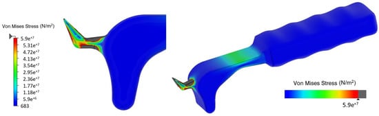 Figure 4 shows that a force of 50 N (about 5 kg) applied at the handle causes a stress on the region that is over the threshold of the tensile strength (about 59 MPa) of the material.