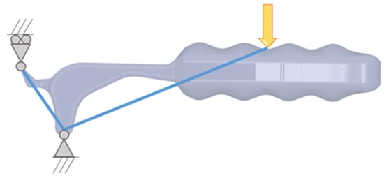 To simulate part behaviour during the can opening, the structural modelling consists of a load positioned at the centre of the handle with vertical direction (load condition), a hinge allowing rotation on the fulcrum and a fixed displacement restraint in the vertical direction on the top of the lifter (restraints), as shown in