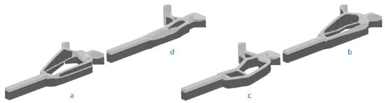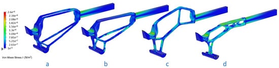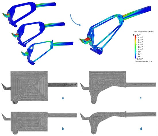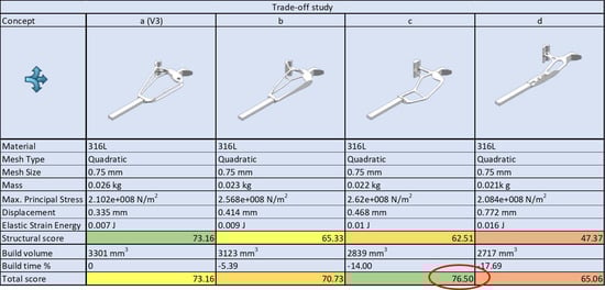 Figure 8 depicts results from the finite element analyses of concept models, respectively, from the enlarged (a), the top-limited (b), the bottom-limited (c) and the fully limited (d) design spaces. Maximum permissible stress is 260 MPa, calculated with a safety factor = 2 from the 316L SS tensile strength.