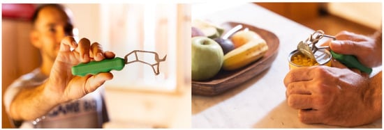 12]. The first part is aimed at opening the can tab, with a lifter able to be inserted under the tab and lift it, and a geometry acting as a lever fulcrum. The second part of the can opener acts as a handle for the patient, and it can be resized in its section sizes and length in accordance with the patient’s anatomy.