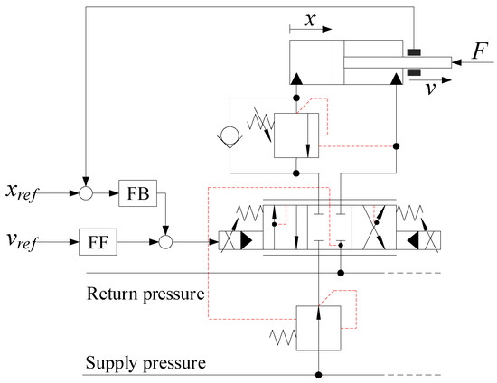 For closed loop control systems, the load independent velocity control can be utilized in a control system using feedforward [1]. In this case, both a position reference and a velocity reference are generated in the control system. An example of a typical closed loop electro-hydraulic motion control system with feedforward is shown in Figure 1. The feedback controller uses the position reference and the measured cylinder position, whereas the feedforward controller uses the velocity reference. The pressure compensator is connected to a supply line which is shared with other actuators. The red dashed lines show the hydraulic pilot lines for the counterbalance valve and the pressure compensator.