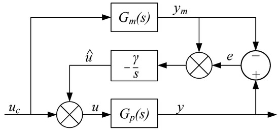 The MIT rule is also used for adaptive control, and is described in [2]. A typical application is model reference adaptive control, shown in Figure 2. Based on the model output , an additional control output is multiplied with the command signal to shape the plant output y. The equations for the model reference adaptive control is shown in Equations (5) and (6).