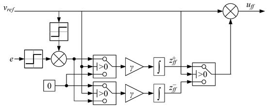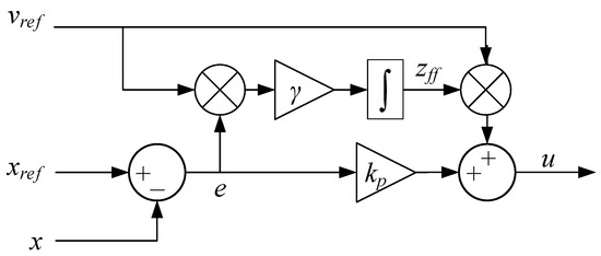 The MIT-rule adaptive feedforward controller uses the position error, the velocity reference, and the constant to update the feedforward gain. The update law and the control output for this adaptive control system is then given in Equations (8) and (9).
