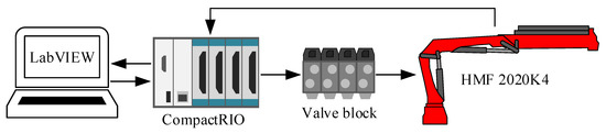 The control system is implemented on a CompactRIO 9075 controller made by National Instruments, Austin, TX, USA. The CompactRIO contains the reference generator and feedforward motion controllers. The block diagram of the connections is shown in Figure 9.