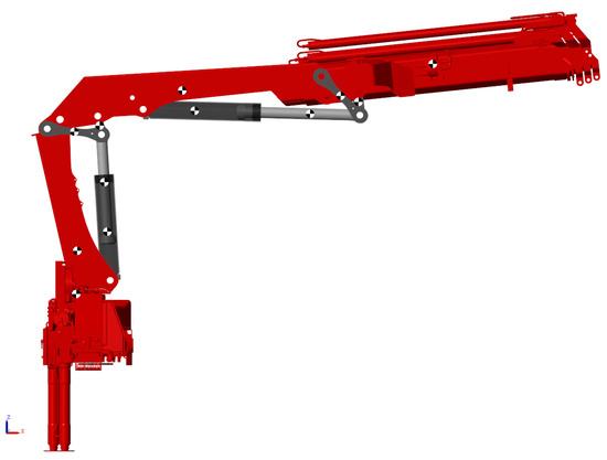 A dynamic model of the crane has been made in Simscape™ by MathWorks®, Natick, MA, USA. 3D computer-aided design (CAD) models have been imported into the model using the Multibody library. The hydraulic circuit has been made using the hydraulic library of Simscape™. A picture of the CAD model is shown in Figure 10.