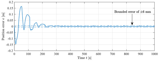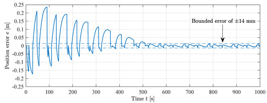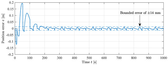 The position error for the sign-sign feedforward simulation is shown in Figure 19. The same bounded error of mm is shown with the dashed lines. The RMS error after convergence is 2.1 mm.