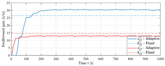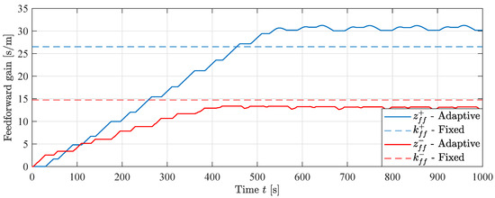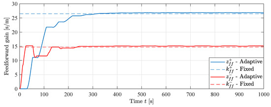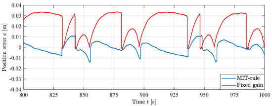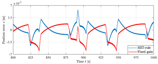 To show the difference in performance between the fixed gain controller and the adaptive controllers, a simulation with fixed gain feedforward has been made and compared with the MIT-rule feedforward at a simulation time where the states have converged, at s. This is shown in Figure 21. It can be seen that the position error for the MIT-rule feedforward is lower compared to the fixed gain feedforward, showing that the MIT-rule feedforward controller outperforms the fixed gain controller even with an ideal model with correlation between cylinder velocity and feedforward gain.