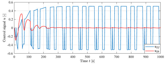 Figure 18 shows the control signals and from the feedforward and feedback controller, respectively. Given that the total control signal , it can be seen that the contribution from the feedforward controller clearly dominates, providing more than 95% at steady state.