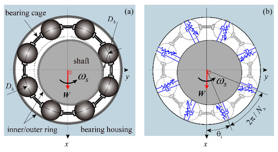 Rolling bearings are widely used in rotating machineries due to their advantages of lower friction compared to sliding bearings and ease with which they can be selected from a manufacturer’s catalogue [11]. There are two major effects of a healthy rolling bearing on machine vibration [12,13]: spring characteristics and the excitation force on the supported structure. In the dynamic design of the bearing-rotor system, the excitation characteristics of rolling bearings should be given adequate consideration. Varying compliance (VC) excitation is induced when rolling elements move along the bearing raceway with an external load, which results in time-varying bearing stiffness in the rotor system. Thus, VC excitation is an inevitable case of parametric excitation [9,14].