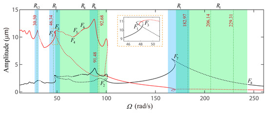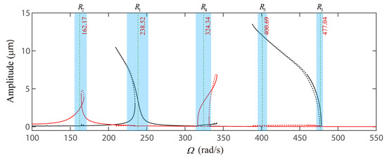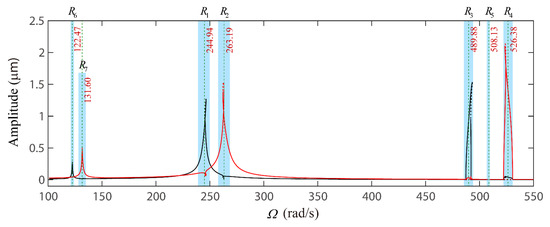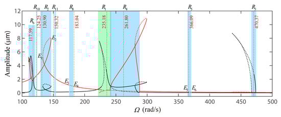 As shown in Figure 12 and Figure 13, the equivalent resonant frequency ωy0 quickly falls relative to ωx0. This results in the resonant amplitudes R2 and R4 shifting to a significantly lower frequency, and the locations of primary resonance R1 and the 1/2-order subharmonic resonance R4 to be closer. For δ0 = 4.0 μm, the equivalent resonant frequencies of the two degrees-of-freedom of System (5) are about ωx0 = 1881.47 rad/s and ωy0 = 1047.21 rad/s, and the amplitudes of R1 and R2 as Ω rotates around ωx0/Nb = 235.18 rad/s and ωy0/Nb = 130.90 rad/s in Figure 14 are the two VC primary resonances, respectively. Herein, the primary resonance R1 and the 1/2-order subharmonic resonance R4 are close to a slight superposition.