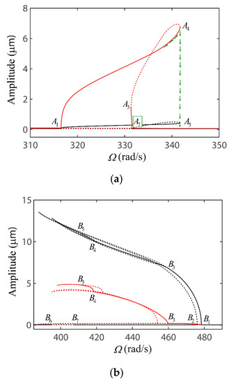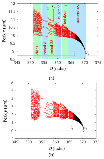 Moreover, the stable period-2 solution branch undergoes supercritical period-doubling bifurcation at B3, generating a stable period-4 branch B3-B4. Then, a period-8 solution branch B4-B5 is excited by supercritical period-doubling bifurcation at point B4., where point B5 is the cycle-doubling bifurcation point. In the above bifurcation process, the strongly excited resonant period-2 and period-4 motion modes in the x direction become saturated at B3 and B4 points, and the energy spills over into the period-4 and period-8 motion modes in the y direction as Ω decreases, respectively. This typical saturation phenomenon has been discussed in [26,27]. In short, the 1/2-order subharmonic resonances are aroused by the period-doubling bifurcation instability, and they contain complex hysteresis characteristics. Finally, as shown in Figure 6, the above results agree well with the numerical bifurcation diagrams from the local-maxima method [52].