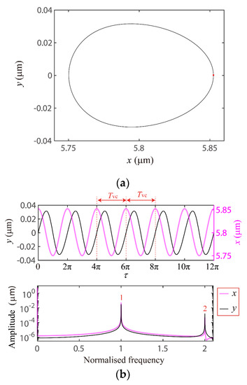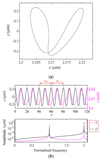 To improve the accuracy and efficiency of obtaining the VC period-M solution, one can introduce a dimensionless displacement X = [X, Y]T = [x/δ0, y/δ0]T, and dimensionless time τ = Nb·Ω·t/M; then, Equation (5) can be expressed as: