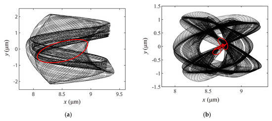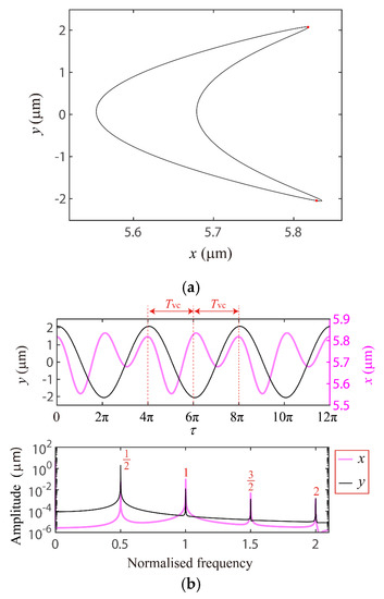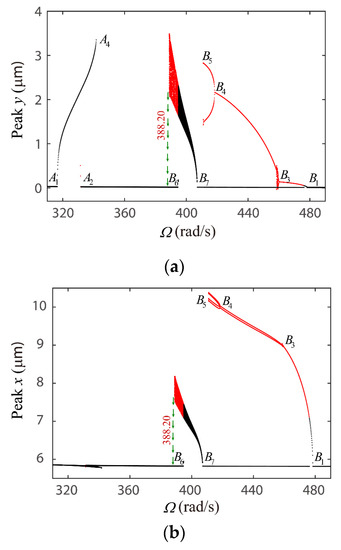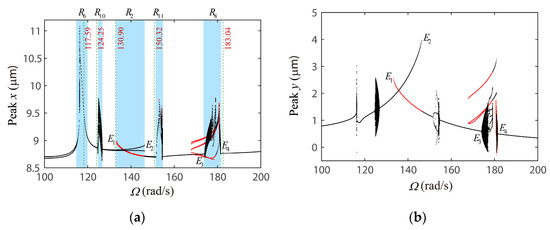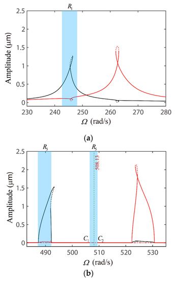 For δ0 = 1.5 μm, Figure 2 shows the VC period-1 and period-2 solution branches traced by the HB–AFT method with arc-length continuation. Predicting from Equations (8) and (9), the equivalent resonant frequencies of the two degrees of freedom of System (5) are about ωx0 = 1908.14 rad/s and ωy0 = 1297.36 rad/s. Thus, the amplitudes in the R1 and R2 frequency ranges, including ωx0/Nb = 238.52 rad/s and ωy0/Nb = 162.17 rad/s, are the VC primary resonances excited in the x and y directions of the system, respectively. These two primary resonances exhibit soft spring and soft–hard spring characteristics in the vertical and horizontal directions, respectively, which agrees with previous theoretical and experimental studies [22,24]. Moreover, 1/2-order subharmonic resonances in two degrees of freedom are excited in R3 and R4 intervals, where the subharmonic resonant amplitudes are around 2·ωx0/Nb = 477.04 rad/s and 2·ωy0/Nb = 324.34 rad/s.
