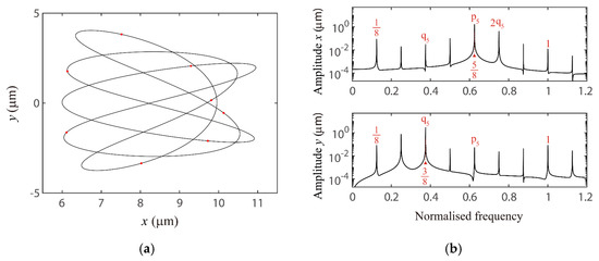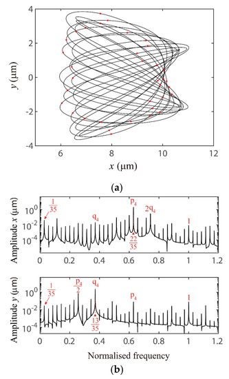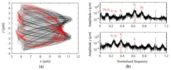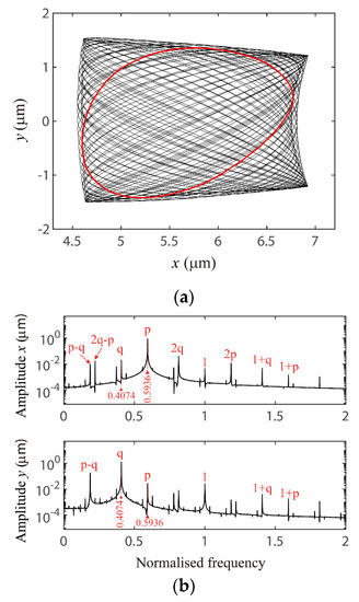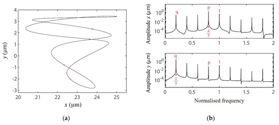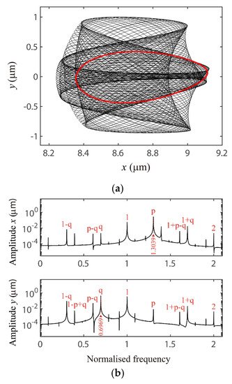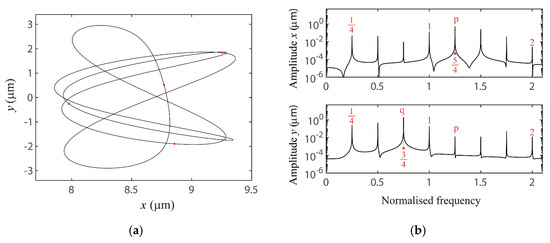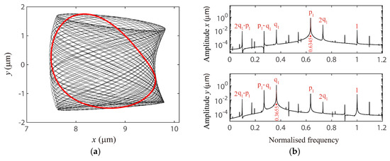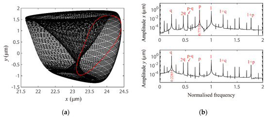 Furthermore, the stable period-1 solution branch undergoes supercritical Hopf bifurcations at points F7 and F8, and the coming unstable solution branch F7-F8 (i.e., R5 range around ωx0/Nb + ωy0/Nb = 229.31 rad/s) contains various VC responses such as period-5, period-6 and beat/chaos-like motions (see Figure 30). The response characteristics of the quasi-period motion as Ω rotates at 242.2277 (i.e., in literature [14], ωs takes 6000 rpm) are presented in Figure 31. Herein, the values of the main incommensurable dimensionless VC frequencies p and q are about 0.7715 and 0.2285, respectively, and p + q = 1, where the value 1 is the dimensionless VC excitation frequency ΩVC = Nb·Ω. Moreover, for the original time scale, the corresponding main frequency components of the response are Nb·Ω ·p 1495.03 rad/s and Nb·Ω ·q 442.79 rad/s, which are close to the predicted equivalent resonant frequencies ωx0 = 1463.75 rad/s and ωy0 = 370.74 rad/s of the two degrees-of-freedom of System (5). As stated in Section 4.1, this indicates that the case of ωx0 + ωy0 = ΩVC combination resonance occurs in range R5. Different from the previous analysis (see Figure 7b and Figure 16b), as shown in Figure 31b, in this case the response–frequency spectrum contains component of 2·q, so there may be the case of ωx0 + 1/2·ωy0 = ΩVC combination resonance also excited in R5, and actually the value ωx0/Nb + 1/2·ωy0/Nb = 206.14 rad/s (see Figure 28) is in range R5. This can explain why the instability range R5 excited by the combination resonance is so large in Fukata’s model. In other words, due to the more asymmetric stiffness characteristics (where ωx0 = 1463.75 rad/s and ωy0 = 370.74 rad/s), Fukata’s model can contain more types of parametric resonances, and these resonances may overlap (literature [27] contains a detailed discussion of this overlapping phenomenon). Due to the vibration mechanism being more complicated, many researchers [44,60] have devoted themselves to investigating the dynamic characteristics of asymmetric rolling bearing-rotor systems. The response characteristics of the period-5 motion as Ω rotates at 211.9492 rad/s (i.e., in literature [14], ωs takes 5250 rpm) are presented in Figure 32, where its main frequency components p and q are 4/5 and 1/5, respectively; satisfying p + q = 1, and using the above analysis process, it can be found that this period-5 response is also excited by the case of ωx0 + ωy0 = ΩVC combination resonance. Therefore, the case of ωx0 + ωy0 = ΩVC combination resonance is the internal mechanism of excitation of various types of VC responses in R5 range described by Fukata et al. [14] (see Figure 30). In addition, it can be easily verified by our analysis process that the resonant amplitude R12 comes from 6-order superharmonic resonance in the vertical direction, because this resonant range emerge as Ω rotates around 1/6·ωx0/Nb = 30.50 rad/s (see Figure 28 and Figure 30). As shown in Figure 33, our above analysis results agree well with the numerical bifurcation diagrams.