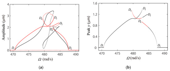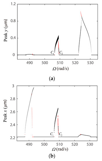 The peak-to-peak frequency–response curves of literature [14], in (a) x and (b) y directions. Herein, the blue and red lines are the period-1 and period-2 solution branches of Figure 28, respectively, obtained by our work.
